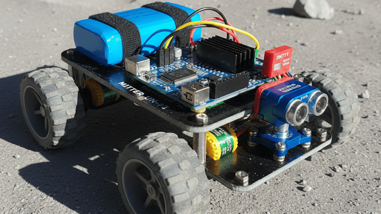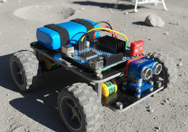 This is a compact lunar-simulation rover that measures temperature, humidity, and terrain conditions while navigating autonomously. With data transmission and obstacle detection, it models real lunar rover operations for research, education, and environmental sensing.